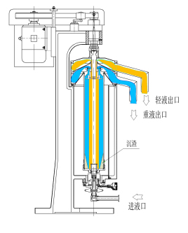 主軸帶動(dòng)轉(zhuǎn)鼓繞自身軸線高速旋轉(zhuǎn),在轉(zhuǎn)鼓內(nèi)形成強(qiáng)大的離心力場(chǎng)。物料由底部進(jìn)料口進(jìn)入轉(zhuǎn)鼓內(nèi),在離心力作用下,迫使物料沿轉(zhuǎn)鼓內(nèi)壁向上流動(dòng),并依其密度差沿軸向形成兩個(gè)同心液環(huán)。輕液由靠近軸心的輕液口排出,通過輕液集液盤回收,重液由靠近轉(zhuǎn)鼓壁的重液口排出,通過重液集液盤回收,微量固體渣沉積在轉(zhuǎn)鼓內(nèi)壁上,停機(jī)后由人工清除。
